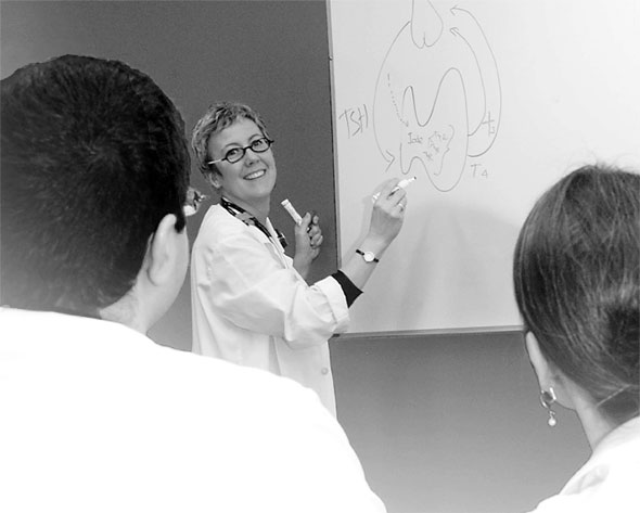 La Dre Samson illustre ainsi son propos : « L’apprentissage du traitement de la pneumonie restera le même, mais le professeur ne se contentera pas d’insister sur le diagnostic et sur le traitement de la maladie. Il devra bien expliquer au patient ce qui se passe, travailler étroitement avec l’infirmière, adopter une attitude éthique dans la prescription de médicaments et gérer son temps de manière à accommoder son patient. »