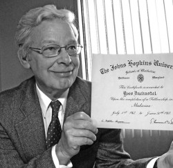 Médecin neurologue diplômé de la Faculté de médecine de l’UdeM en 1959, Yves Duchastel est, selon ses propres mots, un privilégié de la vie. En effet, pendant ses études, il a bénéficié de deux bourses majeures de formation pour aller parfaire sa spécialisation à l’étranger. Après trois années de résidence en neurologie à l’Hôtel-Dieu de Montréal, il reçoit en 1962 une première bourse pour étudier à l’hôpital Johns Hopkins aux États-Unis, puis une seconde en 1963, la bourse McLaughlin, qui cette fois l’amène à l’Institut de neurologie de l’hôpital Queen Square de Londres. Revenu de ces séjours d’études, il travaille à l’Hôpital du Sacré-Cœur de Montréal, où il constitue et dirige une importante équipe clinique neurologique de 1974 à 1980.