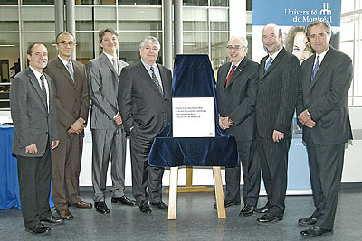 Dr Denis Roy, vice-doyen exécutif de la Faculté de médecine de l’UdeM ; Dr Quoc Hung Ly, de l'Institut de Cardiologie de Montréal ; Dr Serge Doucet, titulaire de la Chaire, chef du service d'hémodynamie et directeur du programme de cardiologie interventionnelle à l'ICM et professeur à la Faculté de médecine de l'UdeM. ; M. Yves Des Groseillers, donateur ; M. André Bérard, donateur ; M. Luc Vinet, recteur de l’UdeM ; M. Jean Royer, président du CA de l'ICM.