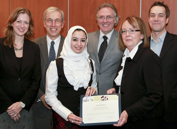 Madame Areej Al Rabea, dont les travaux appuient la recherche sur la fibrose pulmonaire idiopathique au CHUM, est la première récipiendaire de la bourse dont la création est rendu possible par le Fonds Jean et Terry Dionne en recherche sur la fibrose pulmonaire idiopathique et les maladies pulmonaires chroniques. Ce fonds a été créé à la mémoire de M. Jean Dionne, homme de loi important, qui fut notamment juge à la cour du Québec. M. Dionne, décédé en 2008, souffrait de cette maladie. Madame Theresa Lavoie-Dionne, en respectant les volontés de son époux, a créé ce fonds pour soutenir la recherche sur les maladies respiratoires chroniques. La bourse constitue également un appui moral aux travaux réalisés par l’équipe de recherche en pneumologie du CHUM. Les membres de l’équipe de pneumologie, en présence du Dr Claude Poirier, félicitent la récipiendaire et remercient la donatrice pour l’appui apporté à la recherche pulmonaire au CHUM au Pavillon Hôtel-Dieu du CHUM.