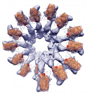 FIGURE: Moyeu du fuseau mitotique (structure en étoile en orange et en gris) amorcé par le signal Cdk-Clb3 (en rouge).