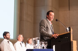 Le témoignage de Vincent Dumez, codirecteur de la Direction collaboration et partenariat patient, a aussi été un événement fort et particulièrement marquant pour les étudiants. Ce pionnier de l’approche qui vise une plus grande participation du patient et de ses proches dans la dynamique de traitement et qui est également patient hémophile vivant avec le VIH a largement contribué à sensibiliser le monde de la médecine pour qu’il s’ouvre davantage au patient. La présence de M. Dumez à la cérémonie témoigne de l’importance que la faculté accorde au patient dans sa formation.